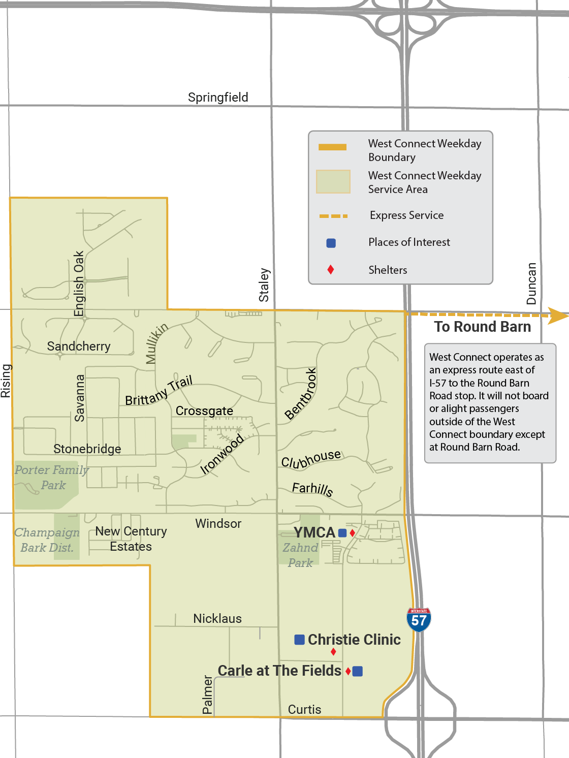 In Southwest Champaign, MTD has made improvements to West Connect, our existing on-demand van service. The boundaries have been expanded to include Carle at the Fields (Fields South Drive), which will give Southwest Champaign residents within the designated boundary (pictured here) the ability to travel directly to medical facilities and area businesses. As with Northeast Connect, the expanded boundary goes into effect on Monday, August 12. Customers may travel within the boundaries of West Connect or they may travel to/from the boundary to access transfer points for fixed route service. West Connect connects passengers with fixed- route bus service at Round Barn Road and the Stephen’s Family YMCA.
