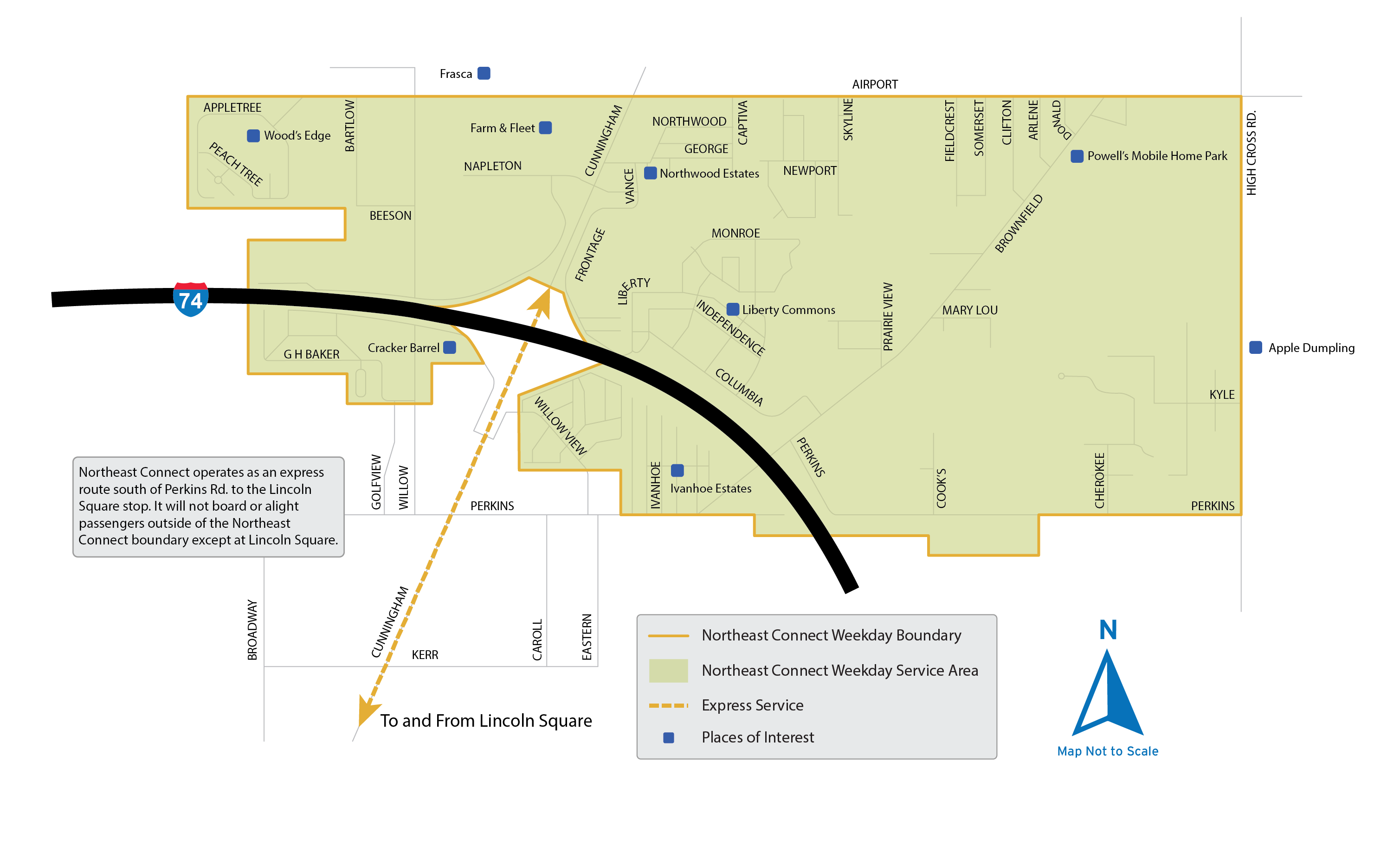 The Northeast Connect service area includes the neighborhoods of Liberty Commons, Ivanhoe Estates, Powell’s, Wood’s Edge, and Northwood Estates. The service area is generally bound by Airport Rd. to the north, Highcross Rd. to the east, Perkins Rd. to the south, and the Wood’s Edge neighborhood and GH Baker Dr. to the west.