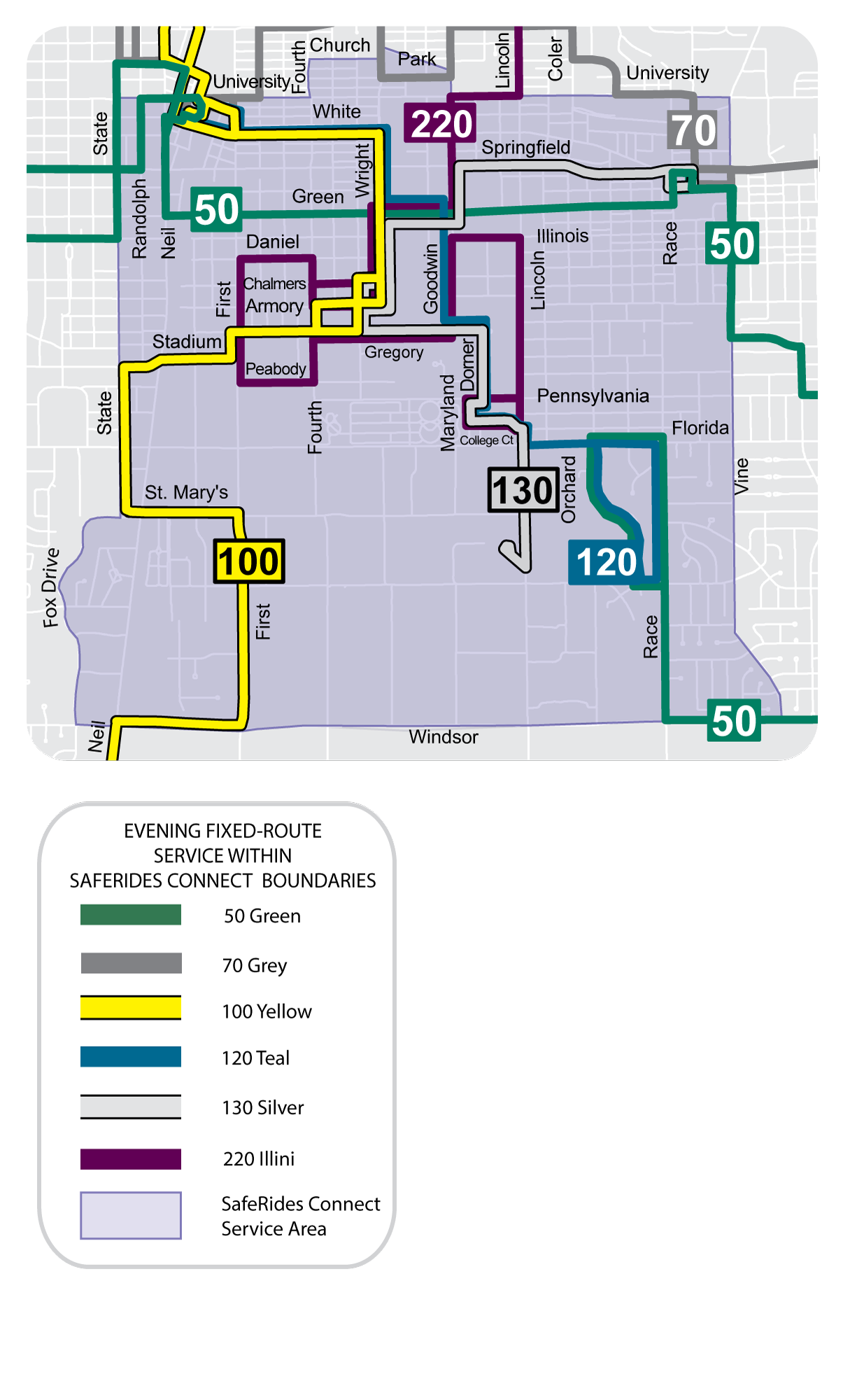 SafeRides Connect is available on the following dates and times during the University of Illinois Fall and Spring